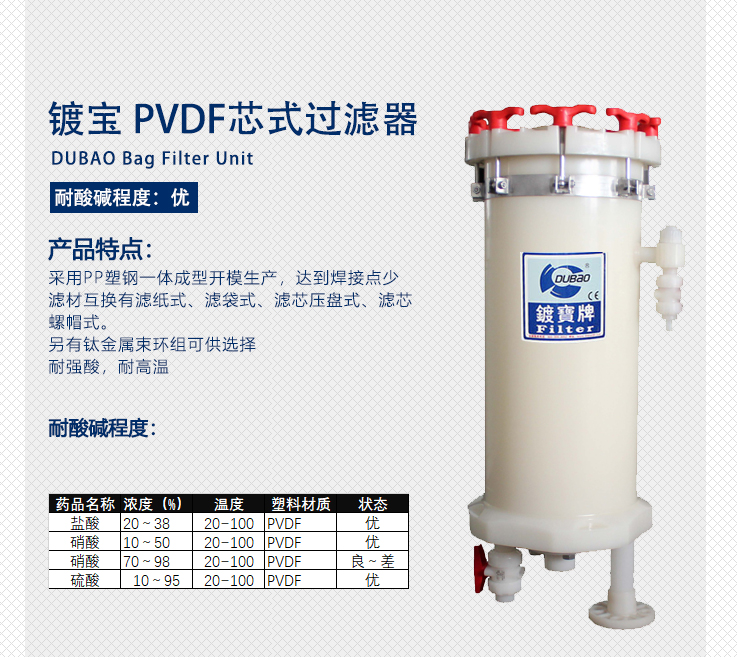 鍍寶耐腐蝕塑料保安過濾器: 產(chǎn)品特點(diǎn): 1、特別適用于電鍍藥夜、化學(xué)藥液、純水循環(huán)過濾等用途。 2、采用日本原裝進(jìn)口......